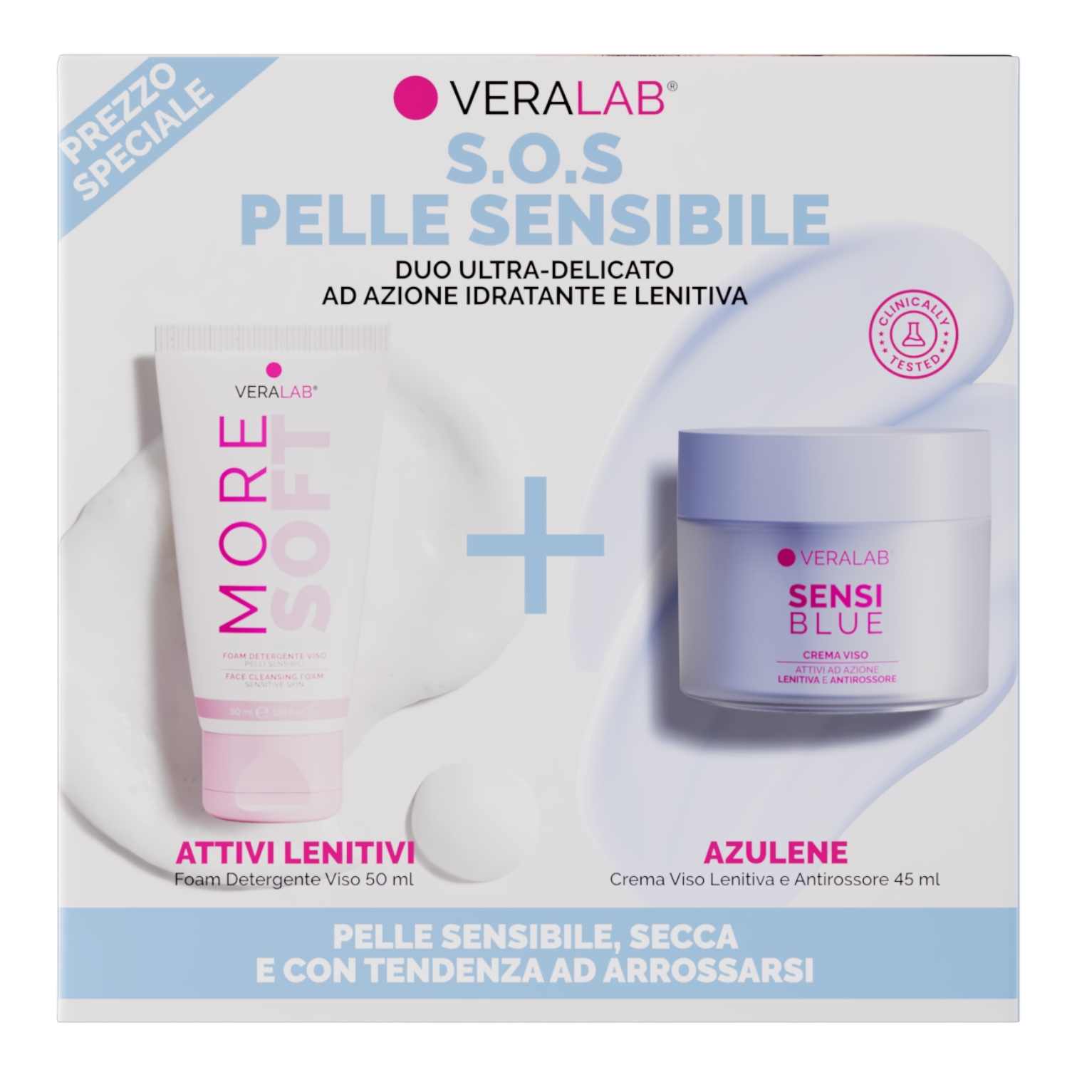 La pelle sensibile è una delle più difficili da gestire: reagisce facilmente agli sbalzi di temperatura, si arrossa, tira e spesso appare disidratata. Veralab, da sempre attenta alle esigenze di ogni tipo di pelle, lancia un nuovo duo pensato proprio per chi cerca sollievo e comfort immediato: il kit SOS Pelle Sensibile.