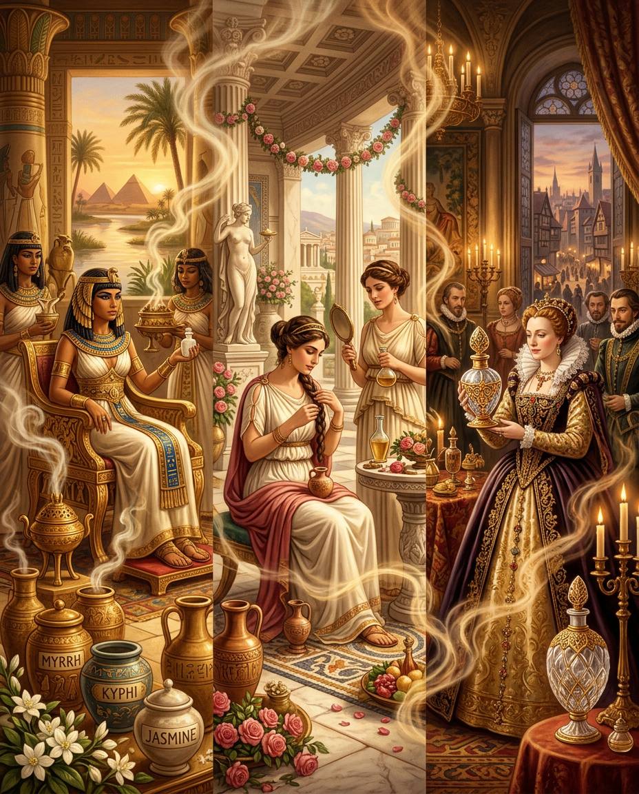 Le prime tracce di profumo risalgono alle civiltà dell’antico Egitto, dove oli aromatici e resine venivano utilizzati nei rituali religiosi e nella cura del corpo. Cleopatra, simbolo eterno di fascino e potere, era nota per le sue fragranze seducenti a base di mirra e gelsomino, capaci di lasciare una scia inconfondibile. In Grecia e a Roma, il profumo divenne un segno di eleganza e distinzione: le donne si profumavano i capelli, le vesti e persino le pareti delle case. Nel Medioevo, le essenze si diffusero grazie agli scambi con l’Oriente, mentre nel Rinascimento il profumo divenne un accessorio di corte, amato da regine e nobildonne.